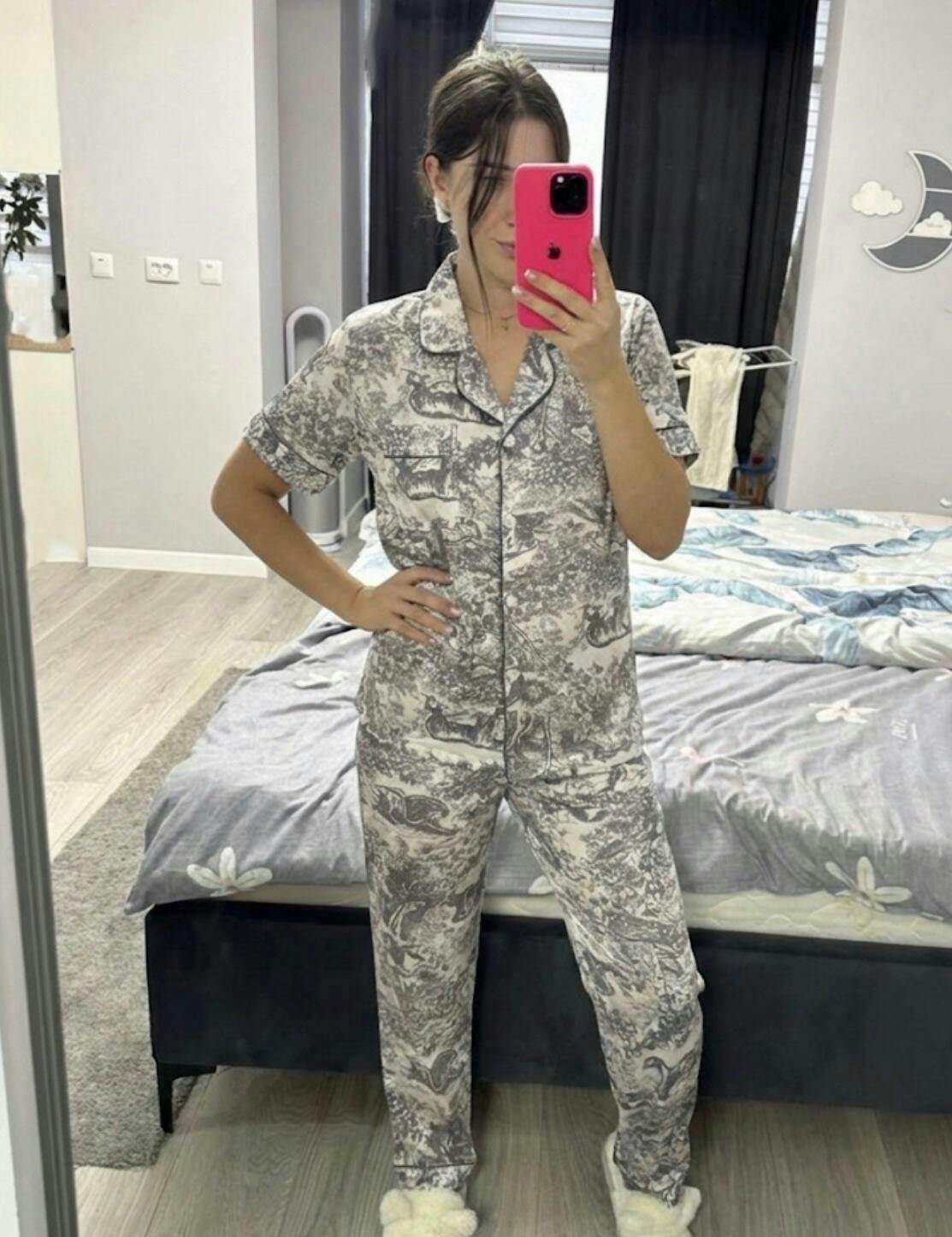 This pajama set features a short-sleeve shirt and full-length pants. High-quality, incredibly soft and pleasant to the touch. The shirt has a relaxed fit, and the pants feature a high-rise waist.