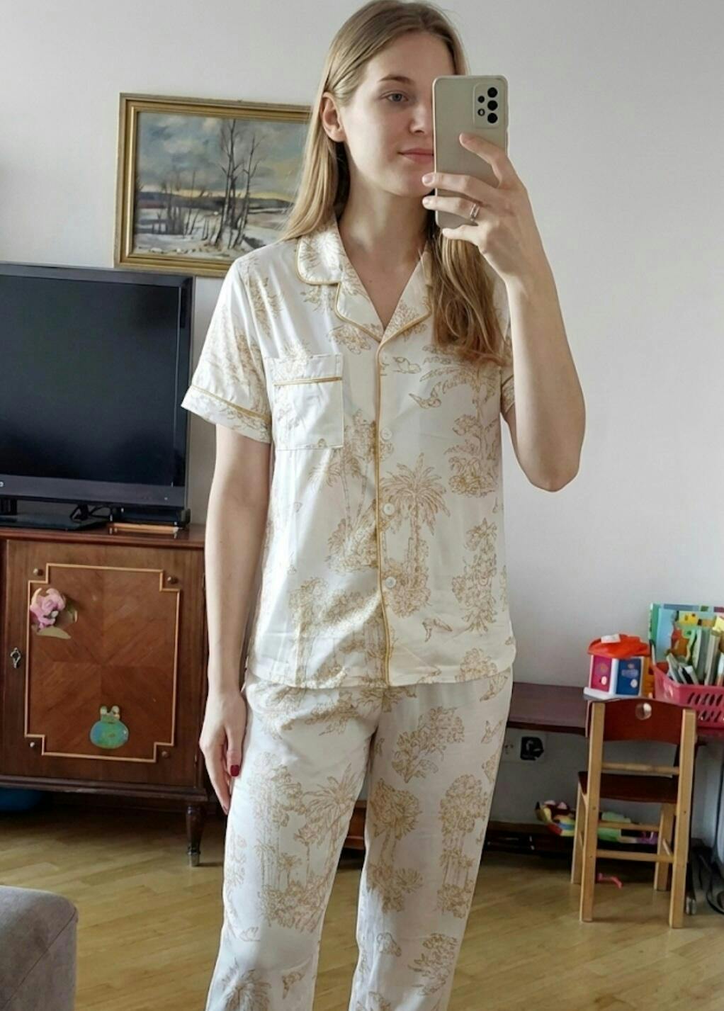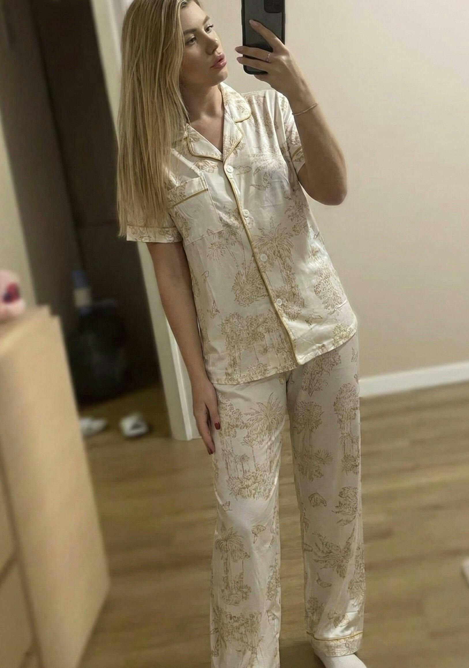 This pajama set features a short-sleeve shirt and full-length pants. High-quality, incredibly soft and pleasant to the touch. The shirt has a relaxed fit, and the pants feature a high-rise waist.
